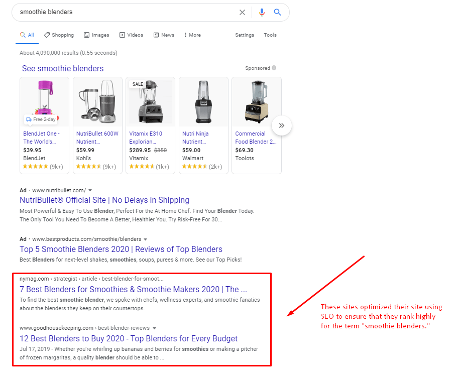 这是因为当您的目标受众搜索与您所提供的内容相关的关键字时,搜索引擎优化的过程允许您在搜索结果中获得很高的展示率。例如,如果您销售冰沙搅拌机,并使用跨境电商独立站 SEO来优化您的网站,那么当用户搜索“冰沙搅拌机”一词时,您在搜索结果页面中的排名会更高。